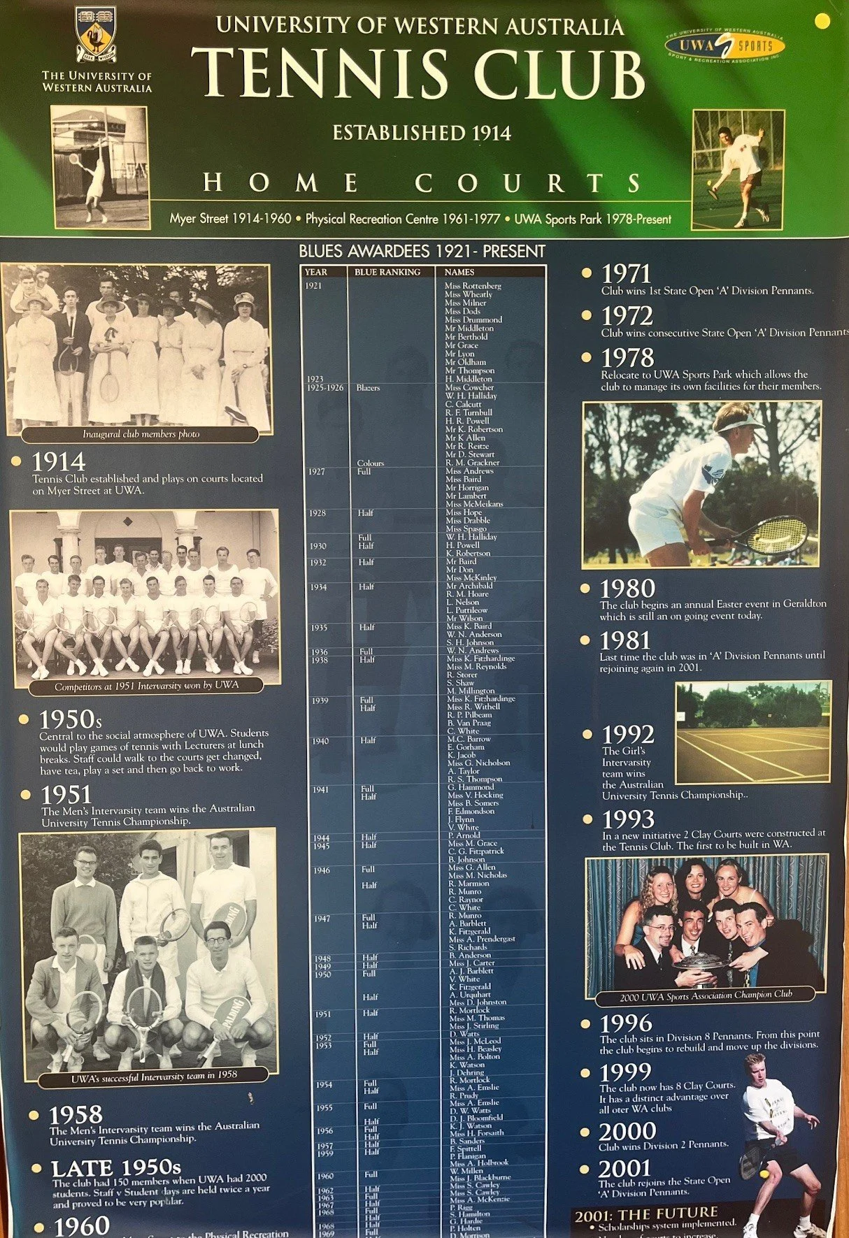 The University of Western Australia Tennis Club (UWA TC) is one of the oldest UWA Sporting clubs, having been established in 1914.